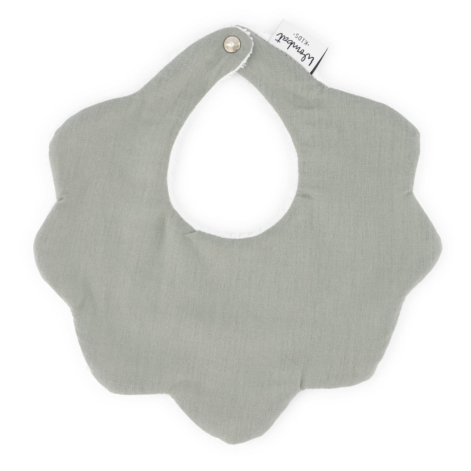 Nuestro nuevo modelo de babero sigue teniendo dos caras; una cara de rizo de toalla y la otra lleva lino verde liquen,